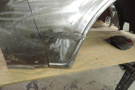 About 95% welded up then ground clean and ready for hammer dolly & shrink disc work. It will still need a flange repair sections front grill mount area & rear body mount area, then it can be fit to the body. The fender will still need more repair work but this will make it mountable for now.