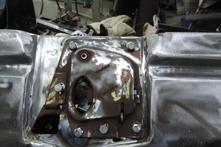 A new bolt plate was made and the old cut off then the engine was moved forward about a fat 3/8 of inch for valve cover clearance and the new plate tacked in place.