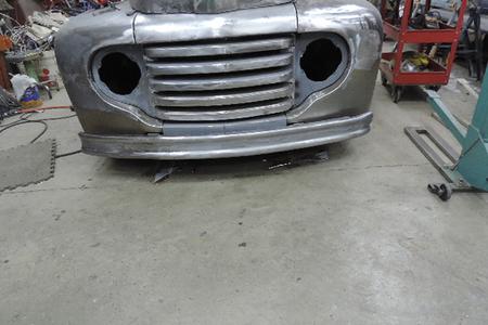 Getting the custom recurved front bumper to this stage took a boat load of hrs. patience and thought, it's called controlled shrinking and stretching to get it here without cutting it a ton and boat loads of welding like the bumper chrome shop said would have to be done. I do love a Challenge. The front sheet metal needs more finish work before the bumper can be finished.