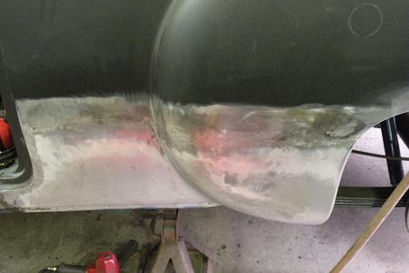 The drivers side rear need some help so it was make a repair section, cut out the bad for a butt weld fit, tack in place then grind smooth hammer & dolly finish weld grind smooth, finish with shrink disc.
