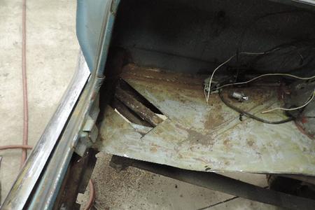 Up front floor braces being removed so the final trimming can be done for the right floor pan.