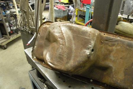 I first removed the inside baffle then hammer & dolly the bottom back into shape with a little shrinking of the stretched areas then re welded the baffle back into place. It wasn't a big job but it was about the details of saving an original pan.